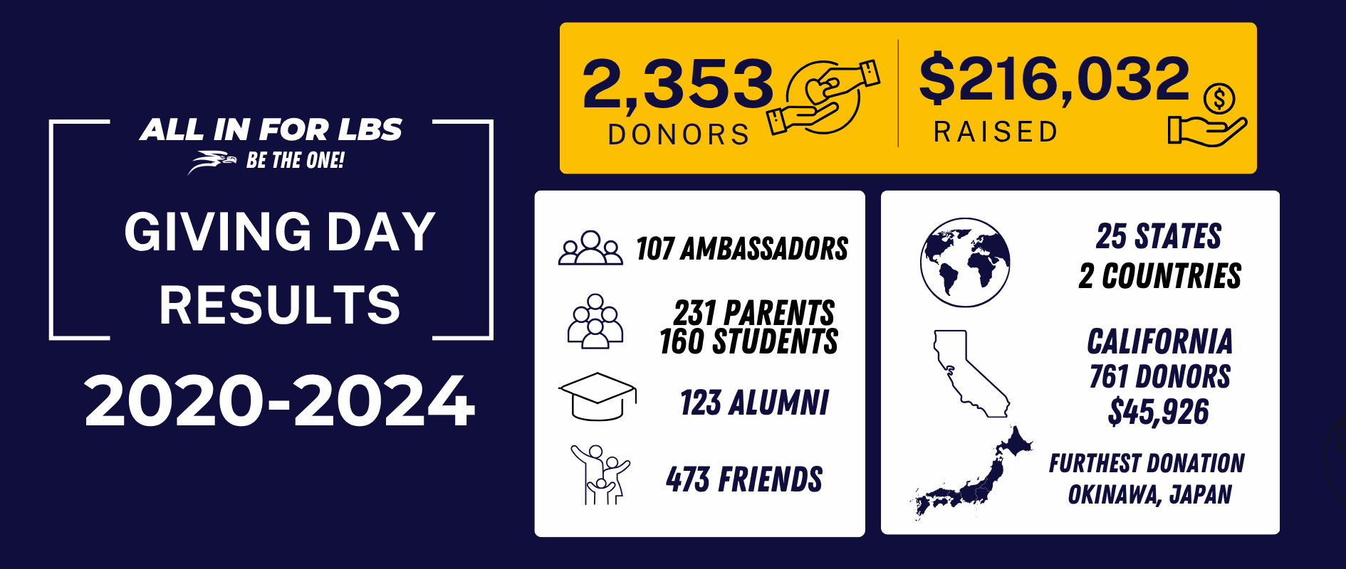 This is our sixth annual giving day and we hope to grow each year. Thank you for joining us and promoting excellent Christian education through Lancaster Baptist School. Check out the results from our previous campaigns below.